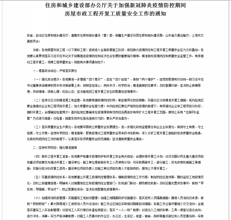 關(guān)于加強(qiáng)新冠肺炎疫情防控期間房屋市政工程開復(fù)工質(zhì)量安全工作的通知